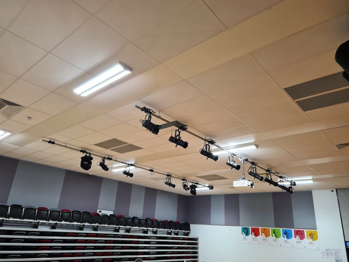 St James Catholic School in Colindale North London recently opened their new theatre space with an LED lighting system, Digital and wireless operated sound, Laser projection, curtains, and tracks black and white backdrop and associated rigging.